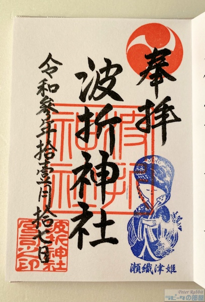 ![]() お目当てはうさぎ!しかし原型をとどめておらず、あちこち補修され今にも崩れ落ちそうになっていました。祭事の準備をされていた氏子の方が説明してくだったのですが、このうさぎ像は、昭和2年にうさぎ年の同級生グループが寄贈したもので、特に云われはありませんとのことでした。波乗りうさぎが珍しいということで、マリンスポーツをされる方が訪れることもあるそうです。 ![]() 瀬織津姫のイラストが描かれた栞 祭られているのは瀬織津姫(セオリツヒメ)で、人間の罪と汚れを流し去ってくれる祓戸(はらえど)の神様。大ヒットアニメ映画「君の名は」は瀬織津姫をイメージした作品という噂があるそうです。ネットで調べると色々と出てくるので興味があったら見てくださいと言われました。このイラストは、地元のイラストレーターが製作されたもので、神社の御守護に活用されています。 ![]() 御朱印 500円 波折神社の御朱印は社務所が留守のことが多く幻の御朱印と言われているそうです。私はたまたま氏子さんたちが見守る中、いただくことができました。ちょうど緑のスタンプが切れたため、紺色の瀬織津姫の印がもらえました。私が第1号だそうです。神主さんが「やっぱり緑がいいかなぁ〜」とボソッとおしゃっていましたので、もしかしたら幻の紺になるかもしれません。 |
