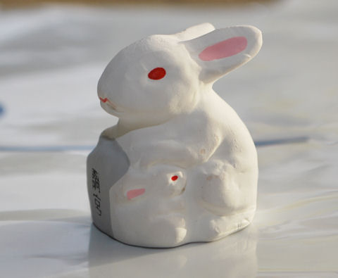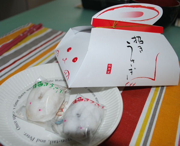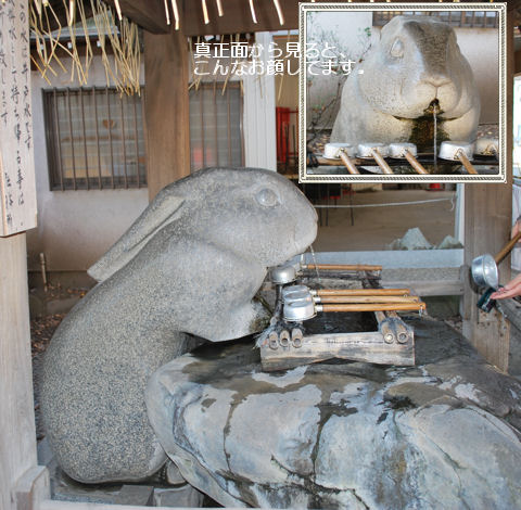 「卯年の初詣は、兎が守り姫の浦和の調神社へ」ということで、2011年の卯年に調神社へ参拝しました。![]() 向かって右側の狛兎 ![]() 向かって左側の狛兎 この神社には鳥居がありません。本来ならば鳥居がある正面入り口の両側に狛兎がいます。 ![]() 手水所のうさぎ。このうさぎが迫力があってちょっと怖い。 ![]() うさぎの巨大絵馬 ![]() 絵馬は、巨大絵馬のデザインと、うさぎが守り姫の調神社オリジナルデザイン柄の2種。 ![]() 本殿の裏にある池にもうさぎが2匹。 ![]() 池の橋を渡った先にあるのは旧本殿。こちらにも矢印の先にうさぎがいます。 ![]() JR浦和駅西口の浦和観光案内所には、御菓子「松月堂」の招きうさぎが購入できます。うさぎの形をしたおまんじゅうが6個入って、餡も3種類。ひと口サイズでおいしいおまんじゅうです。 ![]() 調神社の神楽焼の調宮兎守。狛兎の形がそのまま御守になりました。「この兎を所持して戴くことにより、大神様の広大無辺な御人徳を受けることができます」とあります。あ〜ありがたや、ありがたや。 |