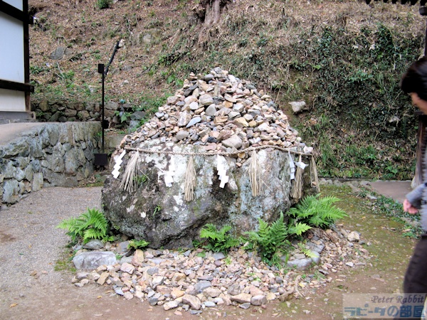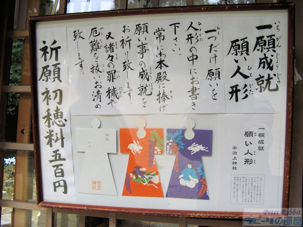 ![]() 宇治上神社 ![]() 立派なご神木、ケヤキは樹齢300年。 ![]() 本殿は、現存する国内の神社で一番古い1060年頃の建立だとか。 ![]() 拝殿前に「清め砂」が盛られています。 ![]() 本殿の横に天降石(てんこうせき)と呼ばれる大きな岩があります。この石の上に願い事をした小石を無事に乗せられたら、 その願いが叶うそうです。 どこにウサギがいるのと心配された方、お待たせしました。 ![]() 願い人形(ひとかた) 十二単の絵姿が描かれた人形に、兎の絵が描かれています。 現在は「宇治」という地名ですが、「莵道」と書いてうじと呼んだところからきているそうで、十二単の柄にも描かれているようです。 ![]() 兎模様のお守り |