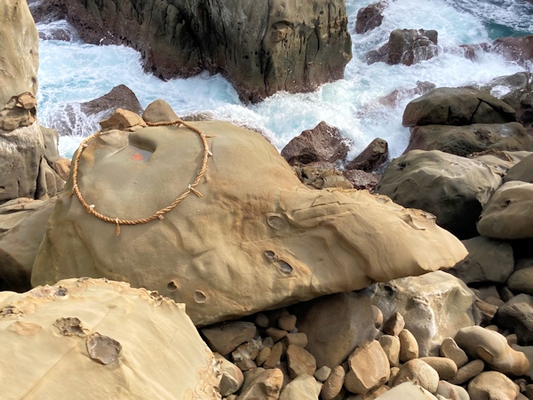 | 宮崎県でうさぎ好きなら立ち寄らずにはいられないうさぎ神社巡りその3鵜戸神宮へ。 日南海岸の日向灘に面した断崖絶壁の下に本殿があり、どうしてこんな所に神様がと不思議な気持ちになりました。 ![]() 参道には寄贈されたうさぎの石像が9体あり、出雲大社で見たうさぎとそっくりでした。この神社の神使が兎だったため、縁の深い動物として慕われているそうです。 ![]() うさぎ、うさぎと数えながら本殿へ。本殿はこの階段の下、左側の崖の中にあります。本殿の天井の岩盤は、宮崎層群と呼ばれる地層のなかでも飛びぬけて厚い砂岩の層で、コンクリ―ションという丸いボールのような塊を含んでいるそうです。このコンクリ―ションという現象が絶妙な条件が揃った時にしか起こらないために、この境内でしか見られない地層とか。ブラタモリでも紹介されたそうです。 ![]() 本殿の奥にある撫でうさぎ うさぎを撫でると病気平癒開運飛翔の願い事が叶えられると言われているそうな。 ![]() 撫でられすぎて元々は白うさぎだったのかもしれませんが、そのうち黄金色に光り輝くかもしれません。 ![]() 鵜戸神宮は、うさぎ絵馬、うさぎみくじに、うさぎお守、うさぎ土鈴、破魔矢の台にうさぎがあしらわれと、うさぎづくしなんです。どーしましょうという感じで、開運と家内安全の招福うさぎ守にしました。 ![]() 最初の疑問、どうしてここに神様がというのは、神々の家系図が必要な説明で少々長くなります。木花佐久夜姫の息子の火遠理命(山幸彦)が、妻の豊玉姫との間に生まれた子ども、鵜葦草葦不合命を鵜戸神宮のある洞窟の中で産んだとされ、豊玉姫は実は人魚でその姿を見られ海に帰ってしまうのだけど、子どもがいつでもおちちが飲めるようにと、本殿の裏におちち岩が本当にあります。 ![]() さらに豊玉姫が急いで海に帰られたので、お付きのカメは姫を待ち続けいつまでもそこに残りカメ石になりました。このカメ石の升のくぼみに運玉が入ると願いが叶うということで、100円で運玉5つ購入し主人が挑戦。男性は利き腕で投げたらダメというルールがあり残念ながら入らず。利き腕なら絶対入ったのにとかなり悔しそうでした。 私はうさぎパワーをもらうつもりが、はしゃぎすぎてまだ午前中なのにクタクタになりました。 ![]() 御朱印 500円 |