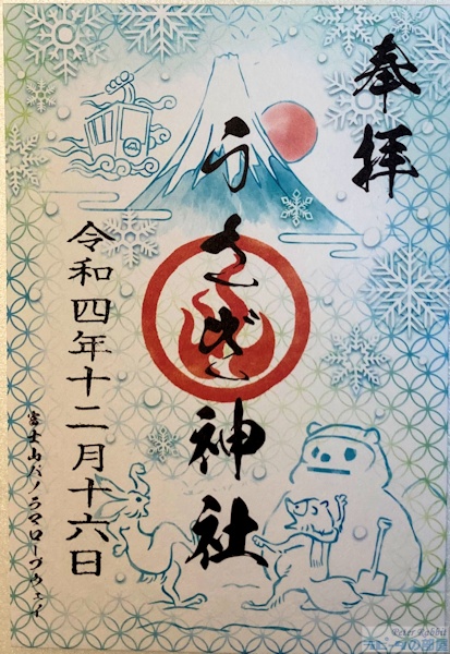 河口湖畔にある天上山(標高1104m)は、別名「カチカチ山」とも呼ばれます。 それは、昔話「カチカチ山」の舞台で、タヌキが泥船で沈んでいくのが河口湖だったと言い伝えられていることからです。 文人 太宰治は『お伽草子』の「カチカチ山」のお話の中で、 「これは甲州、富士五湖の一つの河口湖畔、いまの船津の裏山あたりで行はれた事件であるといふ」と書いています。 ![]() ロープウェイ入口 さて、そんなカチカチ山の舞台、天上山へ行ってきました。 至る所にカチカチ山のお話を再現したオブジェがあります。たぬきは泥船に、 うさぎは木船に、そして私たちはうさぎのかごやに乗って天上山へ。 ![]() 天上山には富士山パノラマロープウェイ(片道500円、往復900円)のうさぎのかごやに乗車し、 2分30秒で山の上にある展望台までひとっ飛びです。 ![]() うさぎのかごやの内部もうさぎ柄で統一されています。タイミングよくうさぎのかごやに乗車できましたが、 運が悪かったら?たぬきのかごやかも。うさぎとたぬきが交互にやってきます。 ![]() そんなカチカチ山にうさぎ神社が鎮座しています。昔話「カチカチ山」とも通じる内容で、 昔々天上山にウサギの棲家があり、働き者であったウサギはおじいさんとおばあさんの手伝いをしていて、 よく天上山から三つ峠の方に出かけ行ったそうな。 そんなウサギは、いつしか軽やかな身のこなしから「健脚」の神使として、 さらに急坂をやすやすと登っていく姿から「大願成就」の神様として、うさぎ神社に祀られるようになりましたとさ。 ![]() 狛兎 標高1000m越えに鎮座する神社なので、気温差で石像にひびが入り割れてしまわないか心配です。 ![]() お顔洗い中のティモテ狛兎 ![]() 御祭神 まぁ、なんということでしょう。うさぎ神社の兎様、なんとも神々しい!!お参りに来たかいがありました。 ![]() おみくじ奉納所と富士山 ![]() うさぎ神社の絵馬 ![]() うさぎ神社から天上山山頂へと続く道を10分ほど登りますと、分祀された小御嶽神社の祠がありました。 本宮は、富士山吉田口五合目の小御岳山頂にある富士山小御嶽神社です。 富士山と対峙するこの場所に富士山入山者の無事を祈るために分祀されたそうです。 ![]() うさぎ神社のうさぎ御守り ![]() うさぎ神社の御朱印 400円 ![]() うさぎ神社ってご利益あるのかしらって思っていましたけど、うさぎ好きにはたまらない キュートな御祭神で驚きと共にひとめぼれしましたよ。ぜひ皆さんもご参拝なさってくださいね。 また天上山は、富士山の眺望が素晴らしいビュースポットですので、ダイナミックな景色をご堪能ください。 |