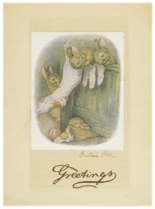 絵柄は、1924年にビアトリクスの父ルパートの主治医サー・アルフレッド・フリップより協力を依頼され、ICAA(疾病児童援助協会)のために作成したクリスマスカードの絵柄のひとつ。最も人気のある絵柄は1932年に発行した「うさぎたちのクリスマスツリー」で、こちらの絵柄は1938年に発行した「フロプシーの子どもたちがクリスマスの靴下をのぞきこむ」の絵柄が採用されました。